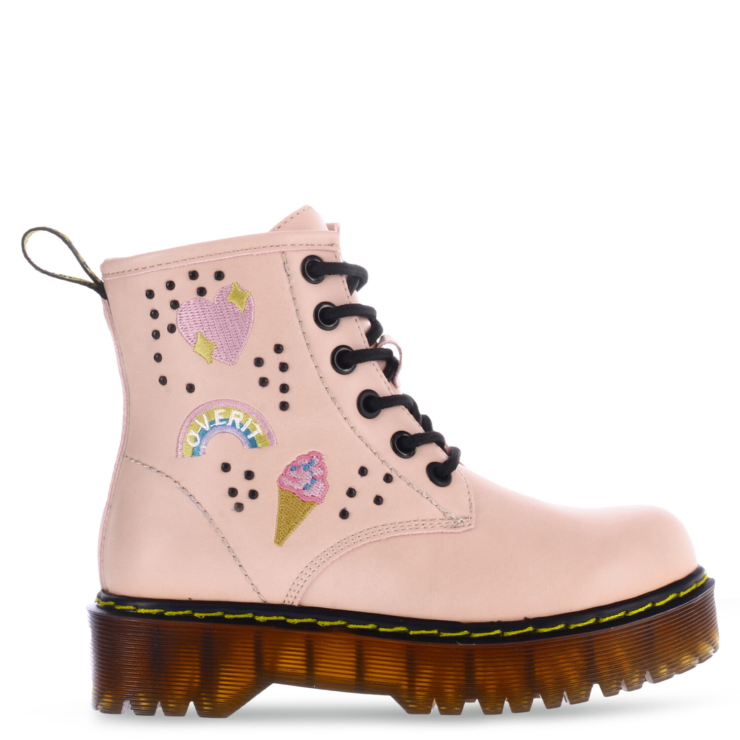 Bota tipo borcego acordonada y con cierre lateral. Con aplique de parches y tachas